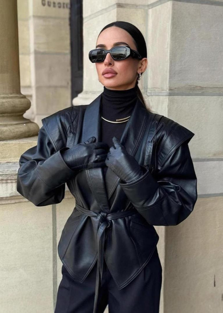 Ontworpen voor een krachtige en elegante uitstraling. De gestructureerde schouders zorgen voor een zelfverzekerde look, terwijl de strik riem de taille accentueert voor een flatterend, vrouwelijk silhouet. Gemaakt van hoogwaardig vegan leer met een gladde, luxe afwerking, voelt deze blazer net zo goed aan als hij eruitziet.