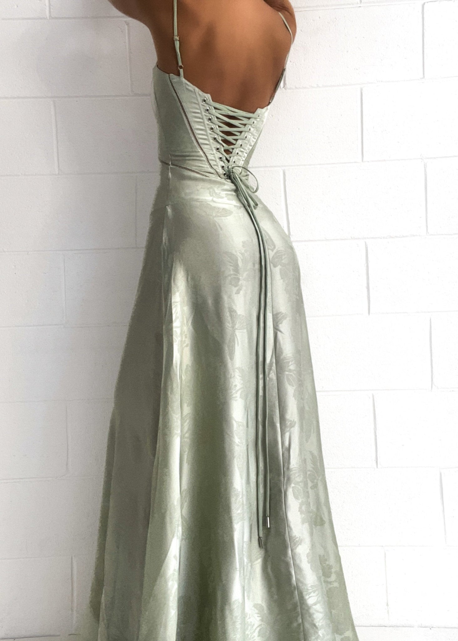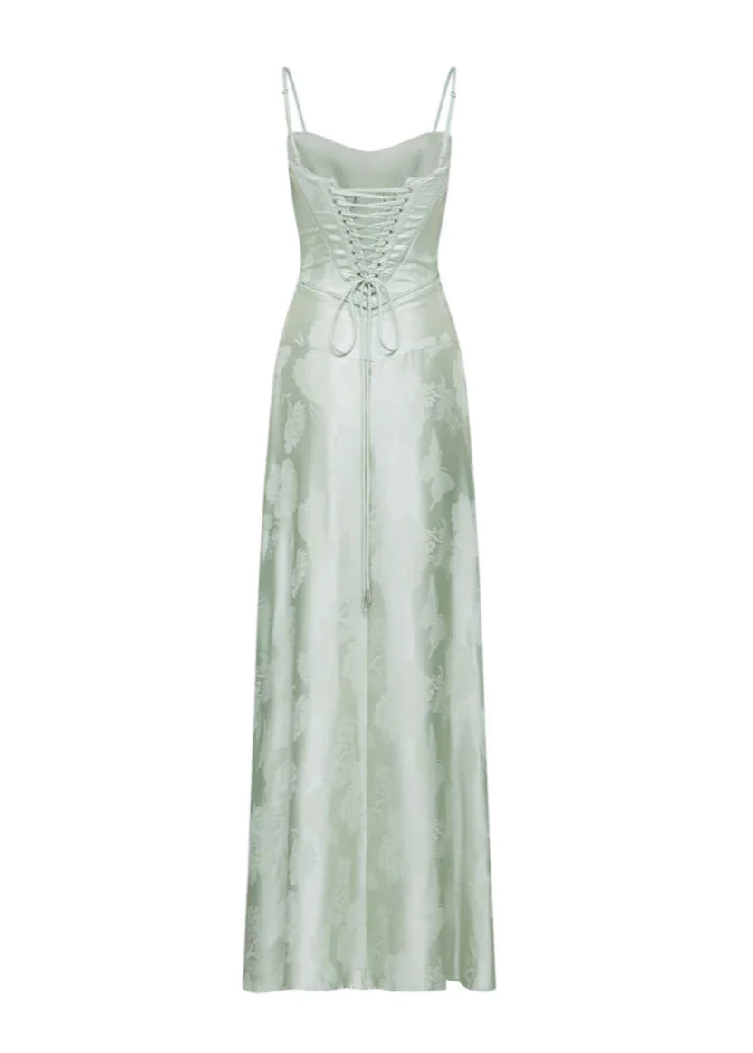 Ontdek de ultieme zomerjurk voor speciale gelegenheden, vakanties of romantische diners. Deze luxe Gilda maxi jurk in zacht pistache groen combineert een vintage charme met moderne elegantie. Gemaakt van hoogwaardig satijnen look burnout-stof met subtiele bloemenpatronen, straalt deze jurk klasse en vrouwelijkheid uit.