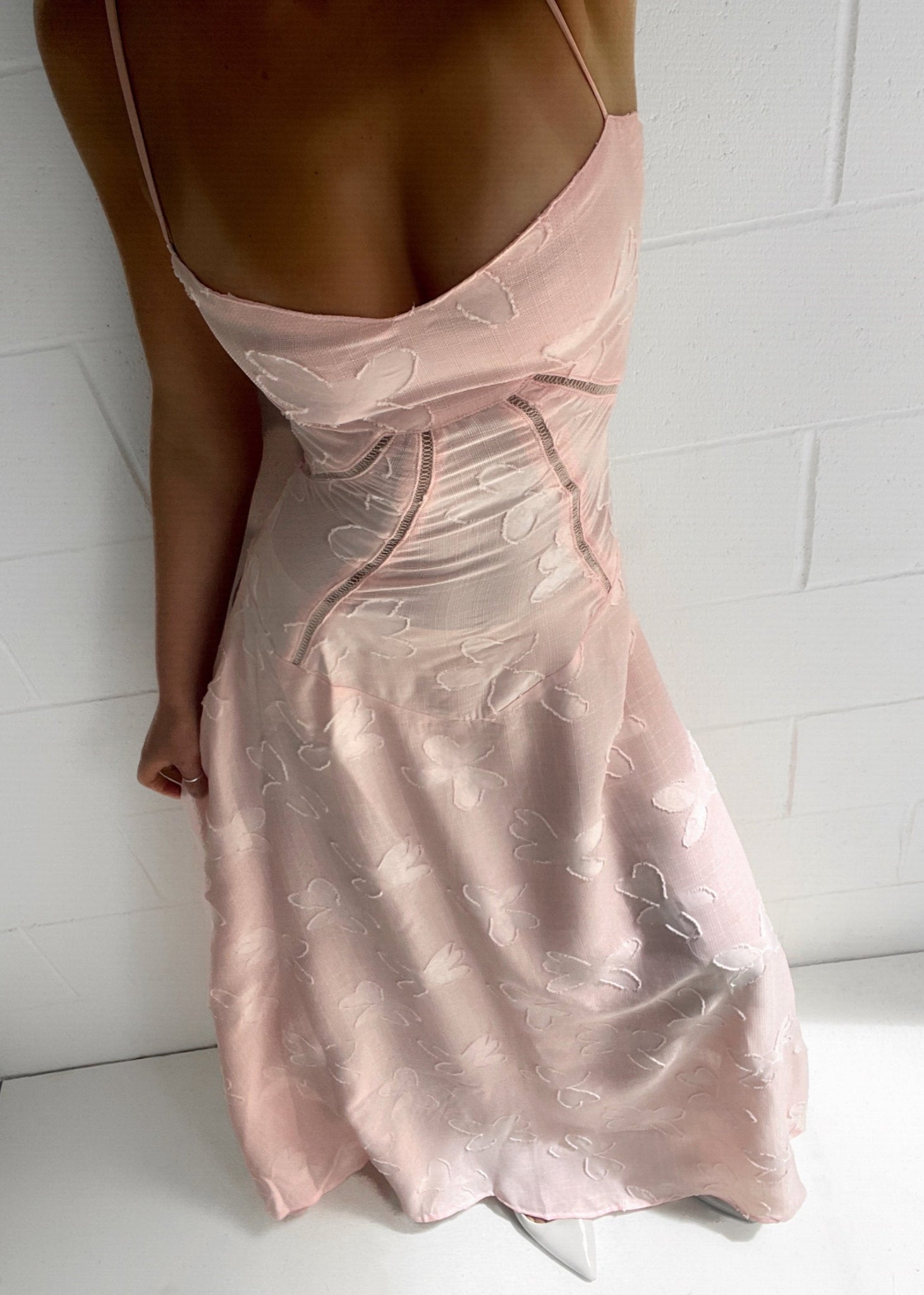 Het nauwsluitende lijfje met gebogen zoom accentueert de taille en vloeit uit in een sierlijke rok tot op de enkels. Dankzij de corset stijl rugsluiting met baleinen en verstelbare rouleau bandjes creëer je moeiteloos een flatterend silhouet. De jurk is semi-transparant en wordt aangeraden te dragen met een nude onderbroekje. De dubbel gevoerde buste biedt ondersteuning, ook zonder bh.