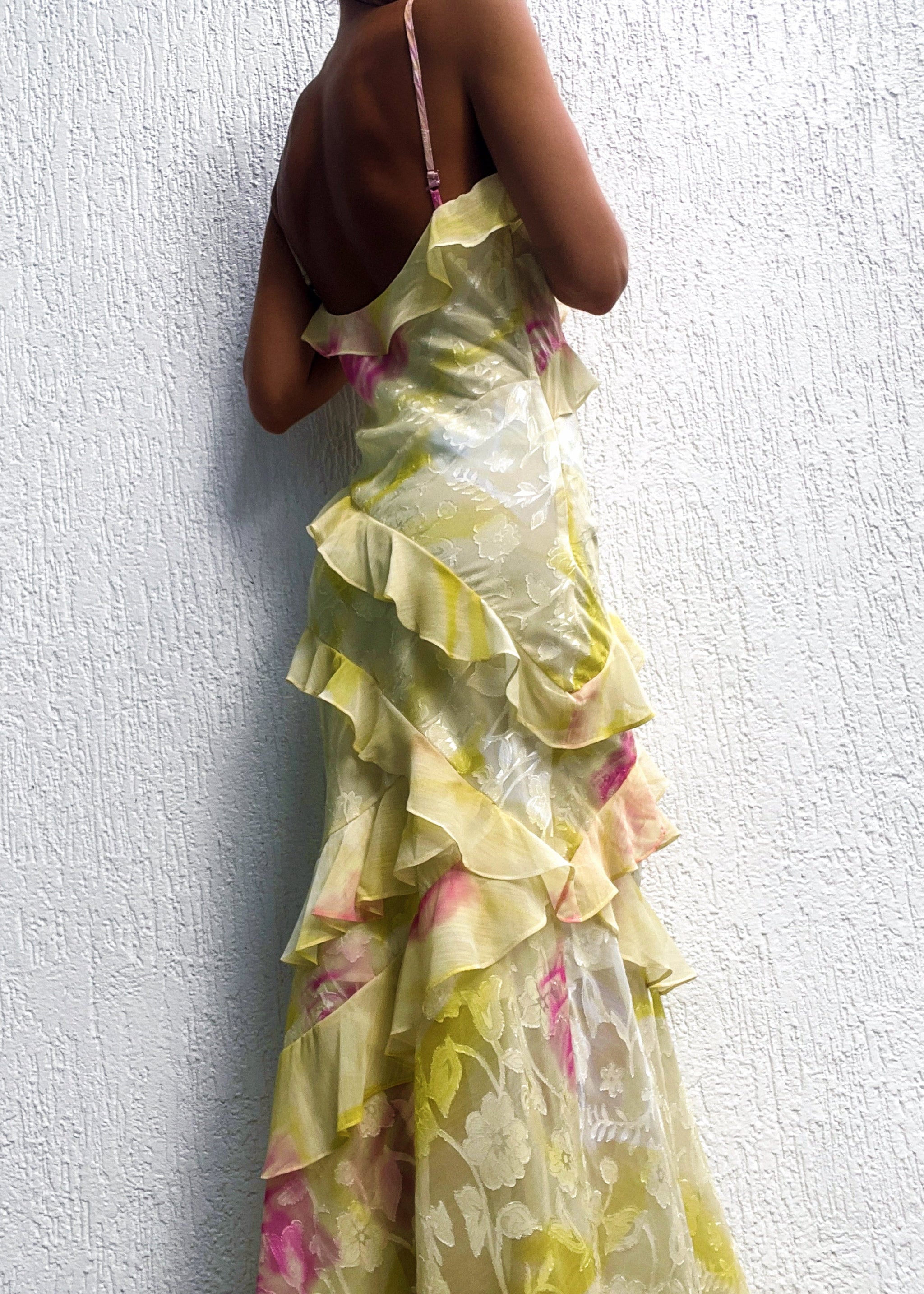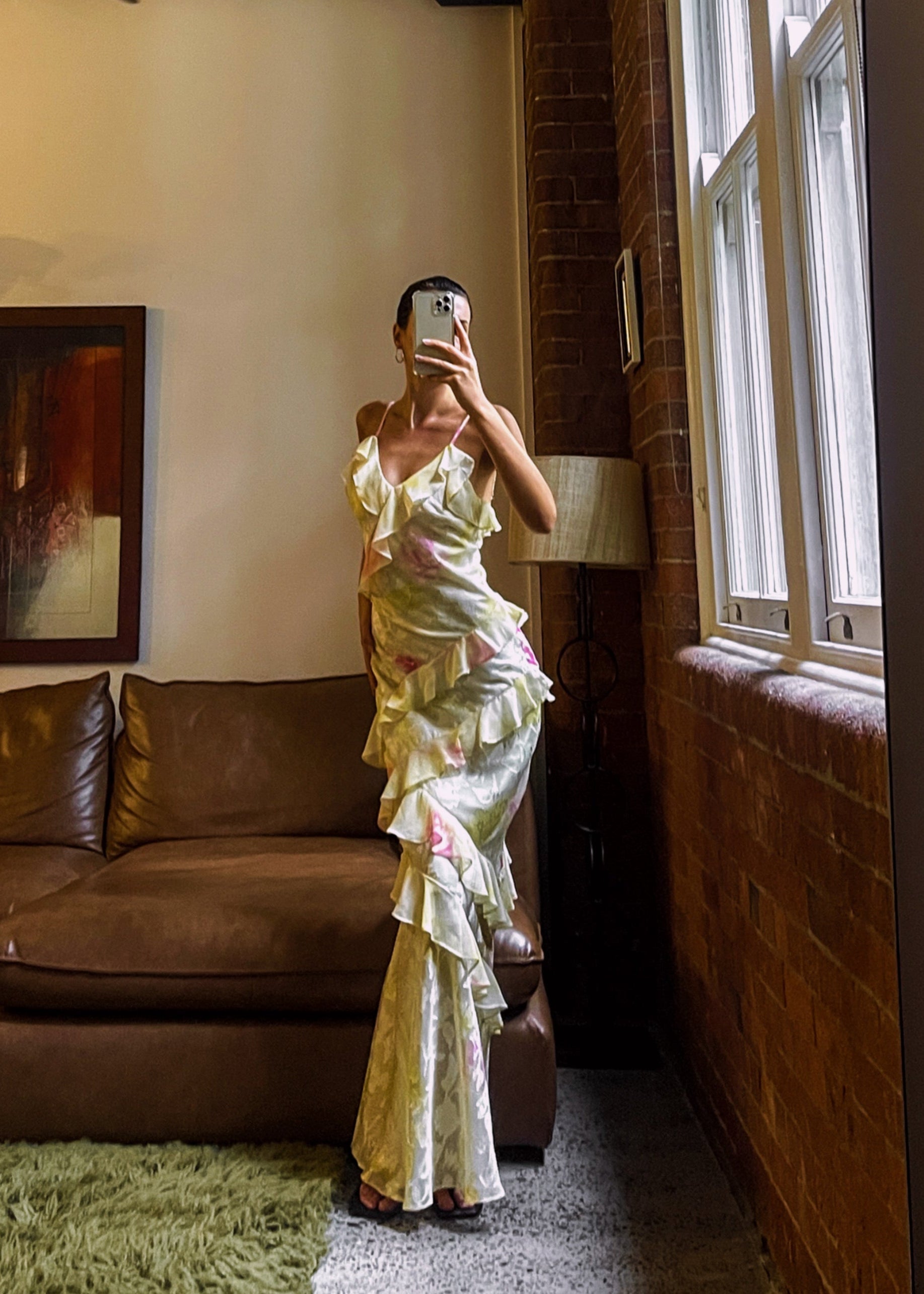 Ontdek de magie van de Mea limoen gele maxi jurk, perfect voor bruiloften, tuinfeesten of zomeravonden. Gemaakt van luxe chiffon met een subtiele glans en bloemendesign, straalt deze jurk pure elegantie uit.